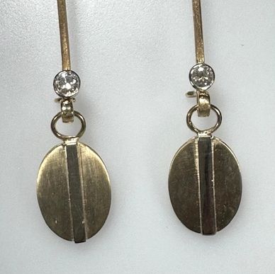 Lady’s 14 karat yellow gold and diamond handmade drop style earring. The earring features a yellow gold wire set on the end with one with one natural round brilliant cut diamond. Two diamonds are a total weight of 0.32 carat, H color, SI1 clarity and bezel set in white gold. Dangling below the diamond is a 14 karat yellow gold satin finished oval plate with 14 karat white gold accent. The earrings ae 2” long x 1/2” wide and is secured with a gravity wire that hooks behind the ear.
