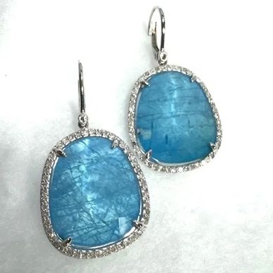 Lady’s Apatite gemstone free formed shaped earring. Each modified oval shaped Apatite gemstone is surrounded by forty-five round brilliant cut natural diamonds. The two Apatites measures 24mm x 20mm; the diamonds are a total weight of 0.25 carats, I color, I2 clarity and shared prong set. The drop style earrings are secured with lever backs.