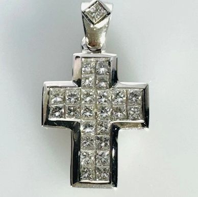 18 karat white gold cross is invisibly set with 25 princess cut diamonds. The diamonds are a total weight of 0.72 carat, G color, VS2 clarity and set within a white gold border. One diamond is bezel set on the tapered bail. The cross is 14.62mm long x 11.77mm wide x 2.79mm deep.